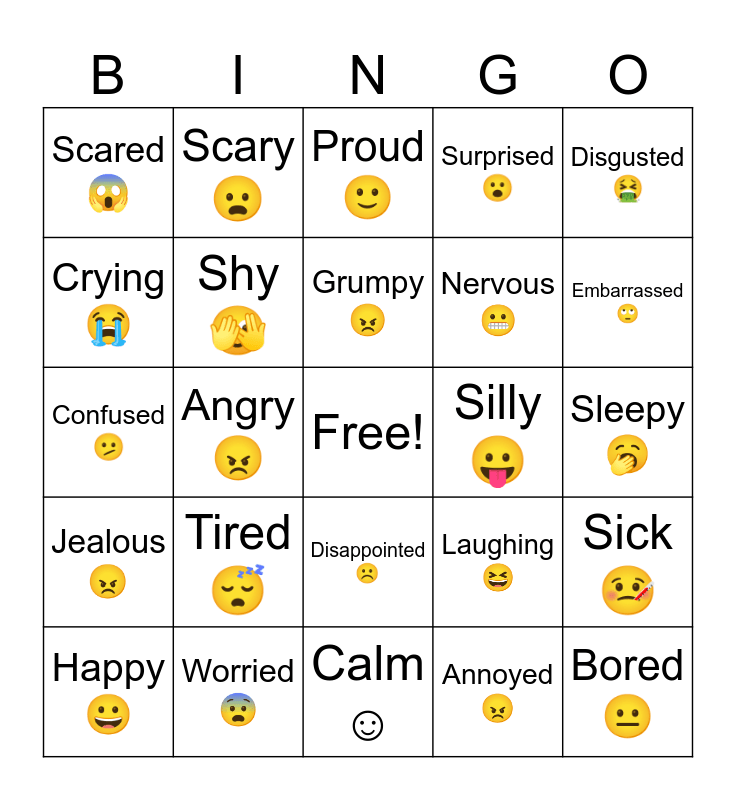 This bingo card has a free space and 29 words: Happy😀, Sad😞, Angry😠, Excited😁, Scared😱, Proud🙂, Shy🫣, Tired😴, Silly😛, Worried😨, Sleepy🥱, Bored😐, Calm☺️, Annoyed😠, Embarrassed🙄, Frustrated😩, Disappointed☹️, Jealous😠, Disgusted🤮, Confused🫤, Laughing😆, Love😍, Nervous😬, Crying😭, Surprised😮, Scary😦, Sick🤒, Grumpy😠 and Shocked😮.