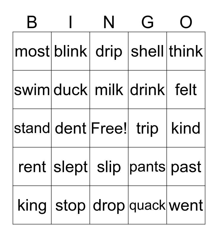 This bingo card has a free space and 24 words: slept, stop, milk, king, think, most, swim, blink, trip, slip, drink, stand, pants, past, duck, quack, kind, drip, felt, dent, went, rent, shell and drop.