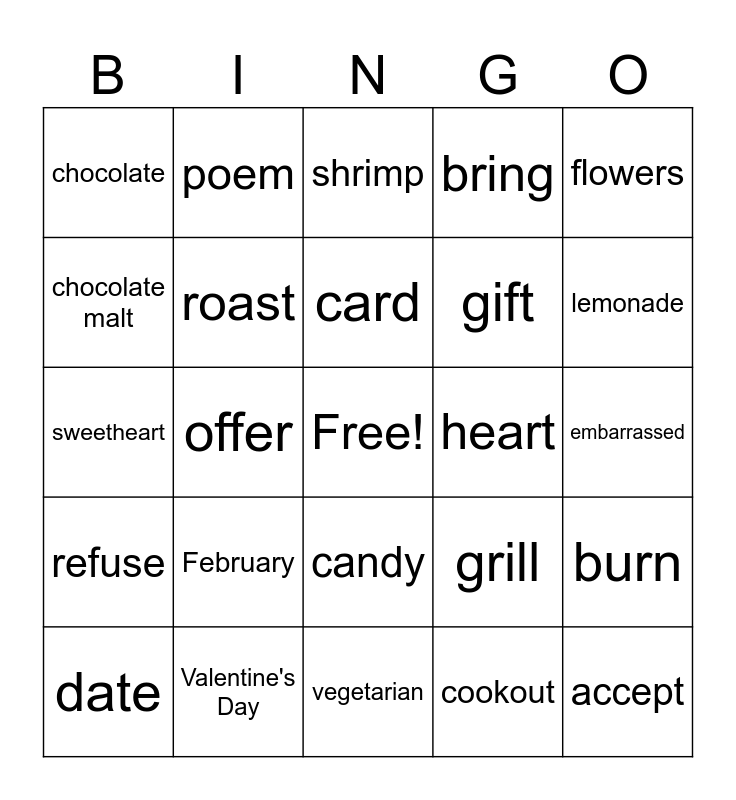 This bingo card has a free space and 24 words: February, Valentine's Day, card, date, flowers, chocolate, chocolate malt, poem, heart, candy, gift, sweetheart, grill, burn, roast, cookout, embarrassed, shrimp, lemonade, offer, accept, refuse, bring and vegetarian.