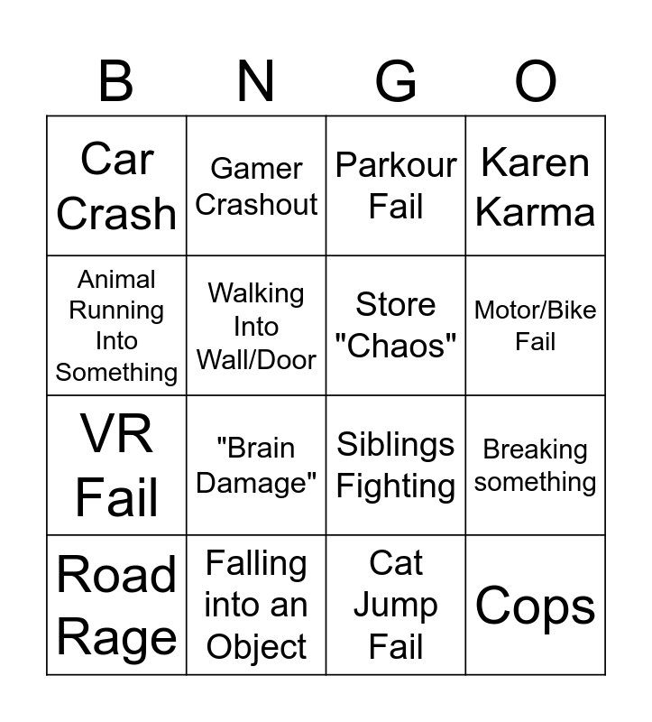 This bingo card has 16 words: Falling into an Object, Breaking something, Parkour Fail, Car Crash, VR Fail, Gamer Crashout, Siblings Fighting, Cat Jump Fail, Animal Running Into Something, Walking Into Wall/Door, Road Rage, Karen Karma, "Brain Damage", Motor/Bike Fail, Store "Chaos" and Cops.