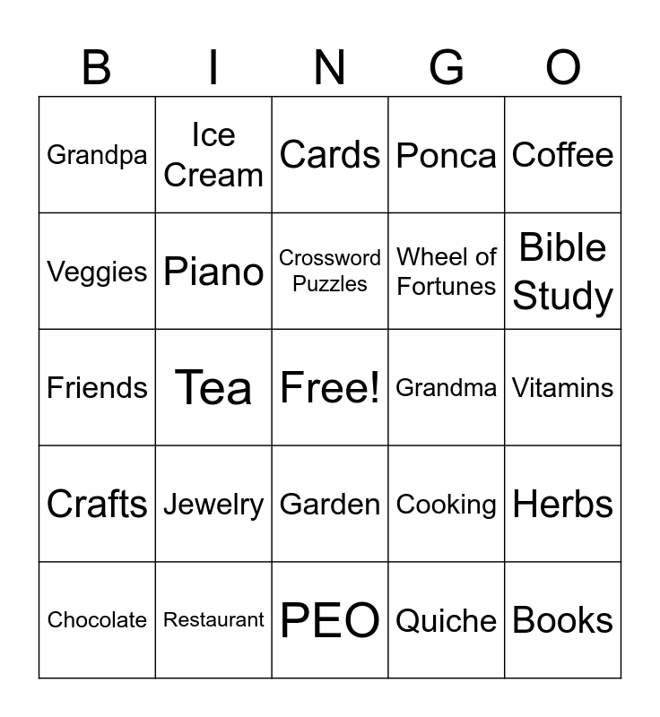 This bingo card has a free space and 29 words: Chocolate, Church, Tea, Nebraska, Grandpa, Cards, Piano, Jewelry, Grandma, Restaurant, Vitamins, Books, PEO, Quiche, Bible Study, Art, Garden, Crafts, Coffee, Friends, Cooking, Family, Wheel of Fortunes, Veggies, Ponca, Ice Cream, Herbs, Crossword Puzzles and Phone Calls.