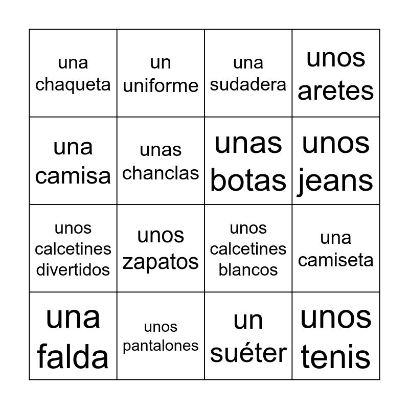 This bingo card has 16 words: unos pantalones, una camiseta, una sudadera, una chaqueta, unos calcetines divertidos, un uniforme, unos calcetines blancos, un suéter, una camisa, unas chanclas, una falda, unos aretes, unos zapatos, unos jeans, unas botas and unos tenis.