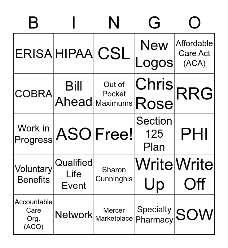 This bingo card has a free space and 24 words: Qualified Life Event, Network, Out of Pocket Maximums, Accountable Care Org. (ACO), Affordable Care Act (ACA), ERISA, COBRA, HIPAA, Section 125 Plan, Sharon Cunninghis, Chris Rose, Work in Progress, Write Up, Write Off, Bill Ahead, Specialty Pharmacy, PHI, CSL, RRG, ASO, SOW, Voluntary Benefits, New Logos and Mercer Marketplace.
