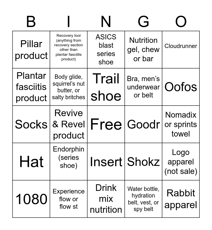 This bingo card has a free space and 24 words: Endorphin (series shoe), Experience flow or flow st, Trail shoe, 1080, Cloudrunner, Pillar product, Plantar fasciitis product, Recovery tool (anything from recovery section other than plantar fasciitis product), Goodr, Insert, Bra, men’s underwear or belt, Socks, Shokz, Logo apparel (not sale), Body glide, squirrel’s nut butter, or salty britches, Water bottle, hydration belt, vest, or spy belt, Nomadix or sprints towel, ASICS blast series shoe, Oofos, Revive & Revel product, Rabbit apparel, Hat, Nutrition gel, chew or bar and Drink mix nutrition.