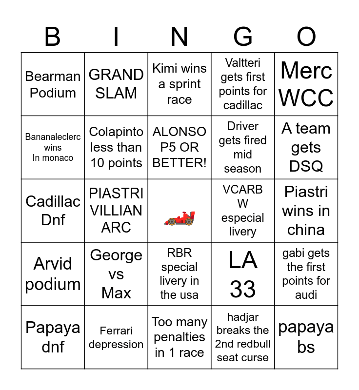 This bingo card has a free space and 24 words: George vs Max, Ferrari depression, ALONSO P5 OR BETTER!, Papaya dnf, Merc WCC, Bearman Podium, Bananaleclerc wins In monaco, GRAND SLAM, VCARB W especial livery, RBR special livery in the usa, Driver gets fired mid season, Cadillac Dnf, LA 33, gabi gets the first points for audi, Colapinto less than 10 points, hadjar breaks the 2nd redbull seat curse, Piastri wins in china, Kimi wins a sprint race, A team gets DSQ, PIASTRI VILLIAN ARC, papaya bs, Arvid podium, Valtteri gets first points for cadillac and Too many penalties in 1 race.