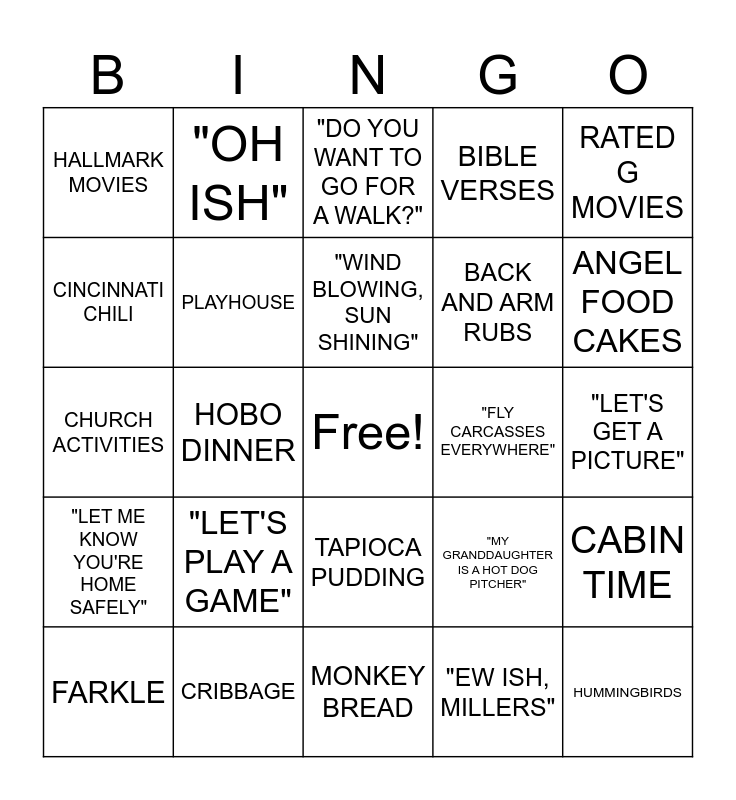 This bingo card has a free space and 28 words: SHRIMP SALAD, CRIBBAGE, "WIND BLOWING, SUN SHINING", "EW ISH, MILLERS", RATED G MOVIES, HALLMARK MOVIES, PLAYHOUSE, MONKEY BREAD, "FLY CARCASSES EVERYWHERE", CABIN TIME, CHURCH ACTIVITIES, HOBO DINNER, "MY GRANDDAUGHTER IS A HOT DOG PITCHER", HUMMINGBIRDS, CINCINNATI CHILI, "IT'S THE BERRIES", TAPIOCA PUDDING, BIBLE VERSES, ANGEL FOOD CAKES, FARKLE, "OH ISH", "WE NEED TO OPEN A WINDOW", BACK AND ARM RUBS, "LET'S GET A PICTURE", "LET ME KNOW YOU'RE HOME SAFELY", "LET'S PLAY A GAME", "DO YOU WANT TO GO FOR A WALK?" and CHRISTMAS STOCKINGS FOR EVERYONE.