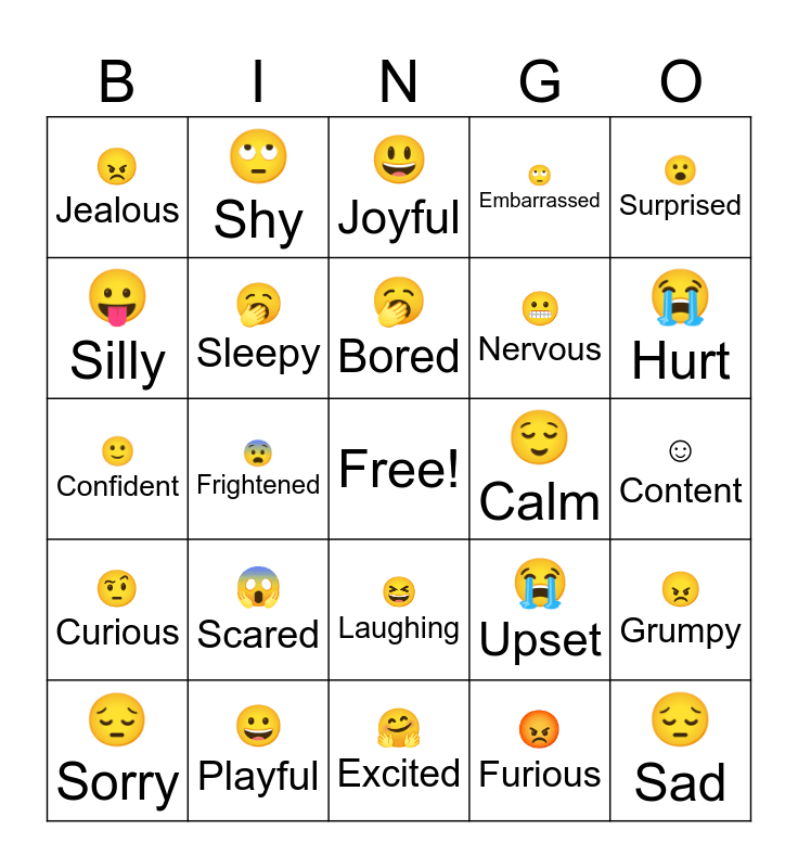 This bingo card has a free space and 49 words: 😀Happy, 😔Sad, 😠Angry, 🤗Excited, 😱Scared, 🙂Proud, 🙄Shy, 😴Tired, 😛Silly, 🫣Worried, 🥱 Sleepy, 🙄 Embarrassed, 😠 Grumpy, 😭Upset, 😮Shocked, 😩 Frustrated, 🥱Bored, 😌 Calm, 🤒Sick, 😮 Surprised, 😨Frightened, 😡Furious, 😠Jealous, 😬Nervous, 🙂Brave, 😭Hurt, 😔Sorry, 😭Crying, 😆Laughing, 🤨 Curious, 🫤Confused, 🤔 Thinking, ☹️ Disappointed, 🤮Disgusted, 😀Playful, ☺️ Grateful, 😇Hopeful, 😊 Glad, ☺️ Content, 😀Friendly, 🙁Gloomy, 😞Guilty, 😴 Exhausted, 😌 Peaceful, 🙂Confident, 😃Joyful, 😀Cheerful, 😭Tearful and 😨Fearful.