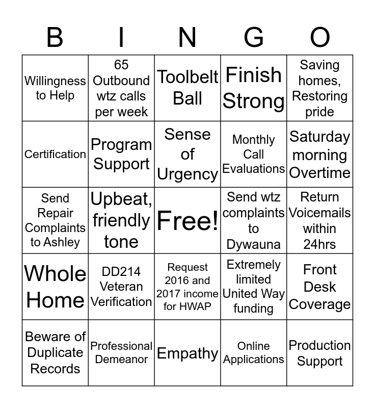 This bingo card has a free space and 24 words: DD214 Veteran Verification, Professional Demeanor, Sense of Urgency, Beware of Duplicate Records, Saving homes, Restoring pride, Willingness to Help, Certification, 65 Outbound wtz calls per week, Send wtz complaints to Dywauna, Request 2016 and 2017 income for HWAP, Monthly Call Evaluations, Send Repair Complaints to Ashley, Extremely limited United Way funding, Front Desk Coverage, Program Support, Online Applications, Return Voicemails within 24hrs, Toolbelt Ball, Saturday morning Overtime, Upbeat, friendly tone, Production Support, Whole Home, Finish Strong and Empathy.