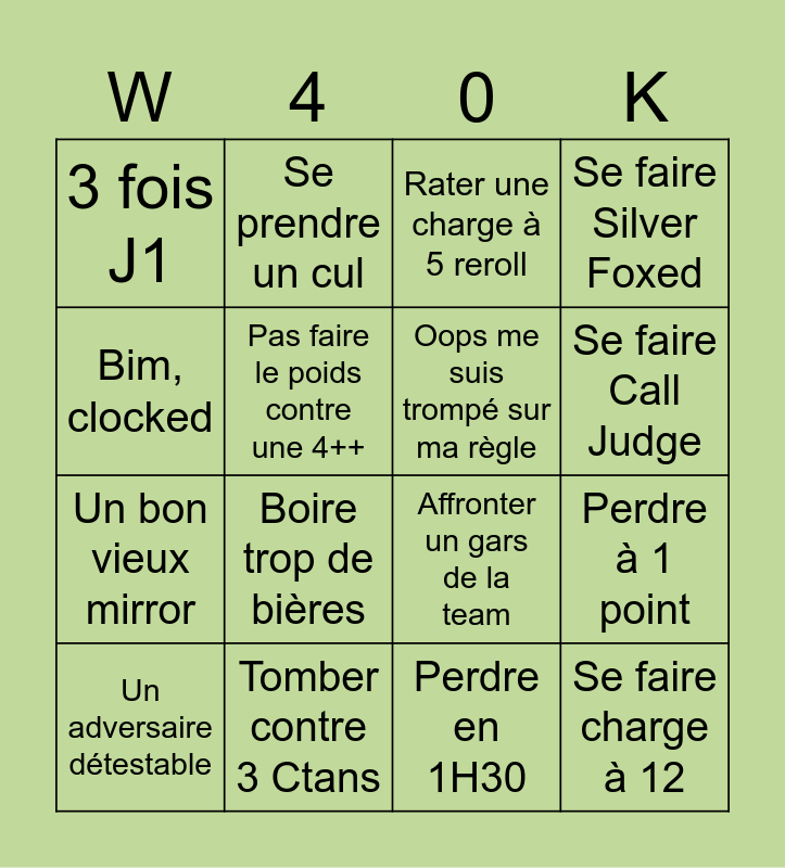 This bingo card has 16 words: Tomber contre 3 Ctans, Perdre à 1 point, Rater une charge à 5 reroll, 3 fois J1, Un bon vieux mirror, Se prendre un cul, Affronter un gars de la team, Perdre en 1H30, Bim, clocked, Pas faire le poids contre une 4++, Un adversaire détestable, Se faire Silver Foxed, Boire trop de bières, Se faire Call Judge, Oops me suis trompé sur ma règle and Se faire charge à 12.