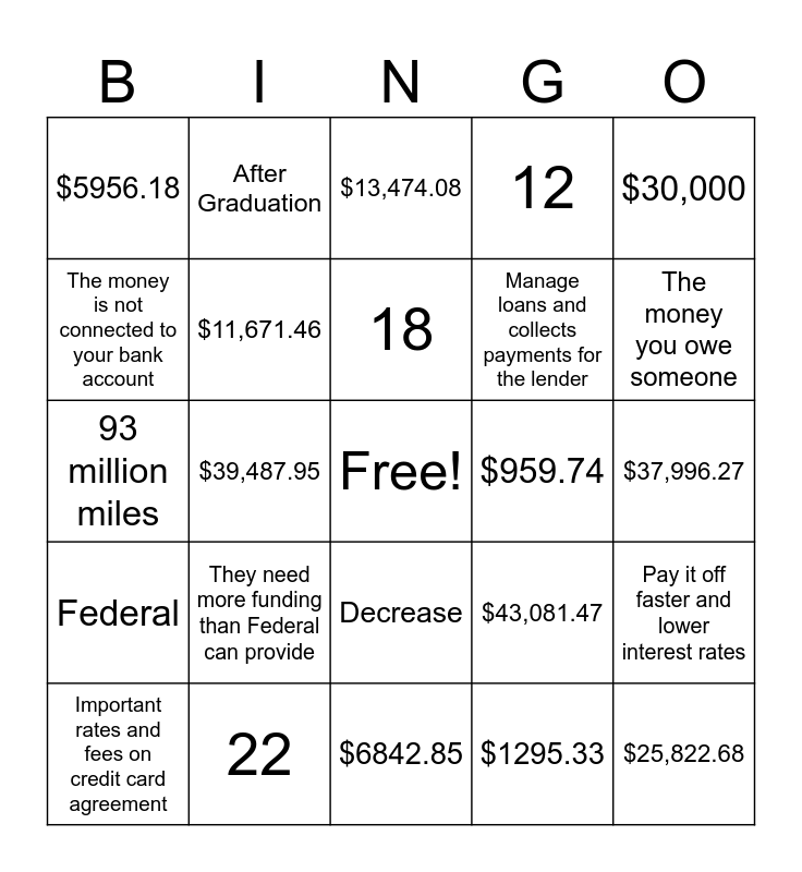 This bingo card has a free space and 31 words: $6842.85, $2858.26, $39,487.95, $14,361.77, $5956.18, $13,474.08, $11,671.46, $43,081.47, $959.74, $1295.33, $37,996.27, $25,822.68, $268,413.28, Direct Subsidized, The money you owe someone, Filling out and submitting FAFSA, Pay it off faster and lower interest rates, They need more funding than Federal can provide, Federal, Decrease, $30,000, False, Important rates and fees on credit card agreement, After Graduation, Manage loans and collects payments for the lender, The money is not connected to your bank account, 12, 93 million miles, 22, 18 and 26.