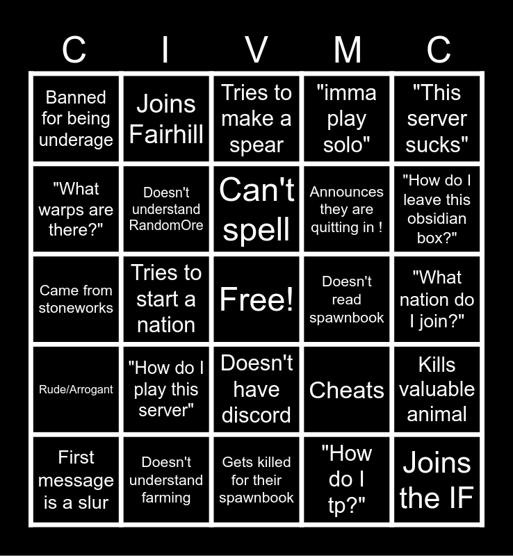 This bingo card has a free space and 29 words: First message is a slur, Full Doxx as ingame name, Tries to start a nation, Tries to take down a major nation, Banned for being underage, Tries to make a spear, Doesn't understand RandomOre, "How do I play this server", Doesn't read spawnbook, Doesn't understand farming, "What nation do I join?", Joins the IF, Gets killed for their spawnbook, "How do I tp?", "How do I leave this obsidian box?", "How do I leave the nether?", Doesn't have discord, Rude/Arrogant, "This server sucks", Came from stoneworks, Cheats, Raids and gets pearled, Announces they are quitting in !, "What warps are there?", "imma play solo", Joins Fairhill, Kills valuable animal, Can't spell and Refuses help.