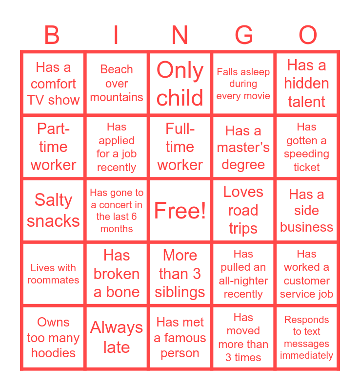 This bingo card has a free space and 45 words: Coffee over sleep, Responds to text messages immediately, Morning person, Owns too many hoodies, Has been out of the country, Has moved more than 3 times, Only child, Can cook a good meal, Has a hidden talent, Always late, Falls asleep during every movie, Loves road trips, More than 3 siblings, Has broken a bone, Can’t handle spicy food, Has met a famous person, Knows how to play an instrument, Salty snacks, Sweet over salty snacks, Has gotten a speeding ticket, Beach over mountains, Mountains over beach, Is a collector, Has a comfort TV show, Can fix something mechanical, Has a side business, Doesn’t like coffee, Taking more than 15 units in college, Has pulled an all-nighter recently, Lives with roommates, Has changed jobs in the last year, Has worked a customer service job, Prefers staying in over going out, Has binge-watched a whole show in a weekend, Is planning something big this year, Has gone to a concert in the last 6 months, Has been to a wedding in the last 6 months, Has been to VBF for less than 6 months, Has taken a trip in the last 6 months, Full-time worker, Part-time worker, Has a master’s degree, Has more than one credit card, Has applied for a job recently and Mooches other people’s streaming services.