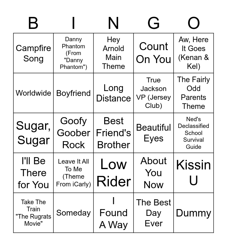 This bingo card has 51 words: Big Time Rush, Best Friend's Brother, Give It Up, I Found A Way, Leave It All To Me (Theme From iCarly), Spongbob Squarepants Theme Song, Danny Phantom (From "Danny Phantom"), Just Fine (Sam & Cat Theme Song), Worldwide, Follow Me (Zoey 101), Boyfriend, Count On You, Kissin U, About You Now, Dancing Crazy, If That's Not Love, Long Distance, Beautiful Eyes, All That (Theme Song), Aw, Here It Goes (Kenan & Kel), Goofy Goober Rock, The Best Day Ever, Campfire Song, True Jackson VP (Jersey Club), I Wanna Be, Dummy, The Fairly Odd Parents Theme, Shiny Teeth, Take The Train "The Rugrats Movie", Hey Arnold Main Theme, Jimmy Neutron Theme, Cat Dog (From "Cat Dog"), Make It Shine (VictoriousTheme), You're The Reason, Gold, Someday, Full House, The Fresh Prince of Bel - Air, The Nanny, I Know, Ned's Declassified School Survival Guide, I'll Be There for You, Thank You for Being a Friend, As Days Go By (From "Family Matters"), Laverne & Shirley, The Main Title Theme, Happy Days (Theme from "Happy Days"), Sugar, Sugar, Theme From The Brady Bunch, "Cheers" Theme, Low Rider and L.A. Boyz.