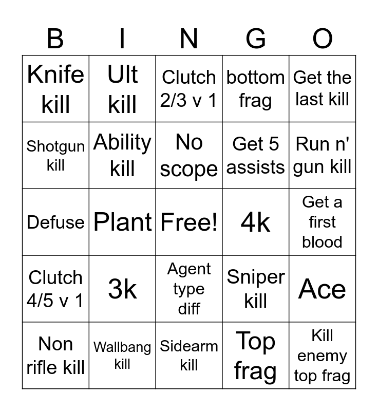 This bingo card has a free space and 24 words: 3k, Wallbang kill, No scope, Non rifle kill, Get the last kill, Knife kill, Shotgun kill, Ult kill, 4k, Agent type diff, Get 5 assists, Defuse, Sniper kill, Ace, Ability kill, Top frag, Get a first blood, Clutch 2/3 v 1, Run n' gun kill, Plant, Kill enemy top frag, Clutch 4/5 v 1, bottom frag and Sidearm kill.