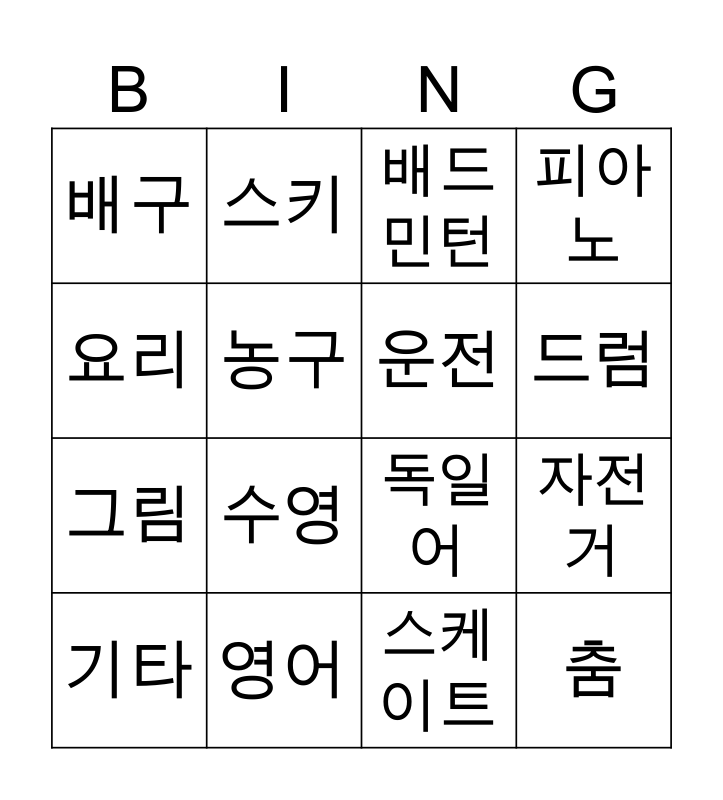 This bingo card has 16 words: 영어, 자전거, 배드 민턴, 배구, 그림, 스키, 독일어, 스케이트, 요리, 농구, 기타, 피아노, 수영, 드럼, 운전 and 춤.