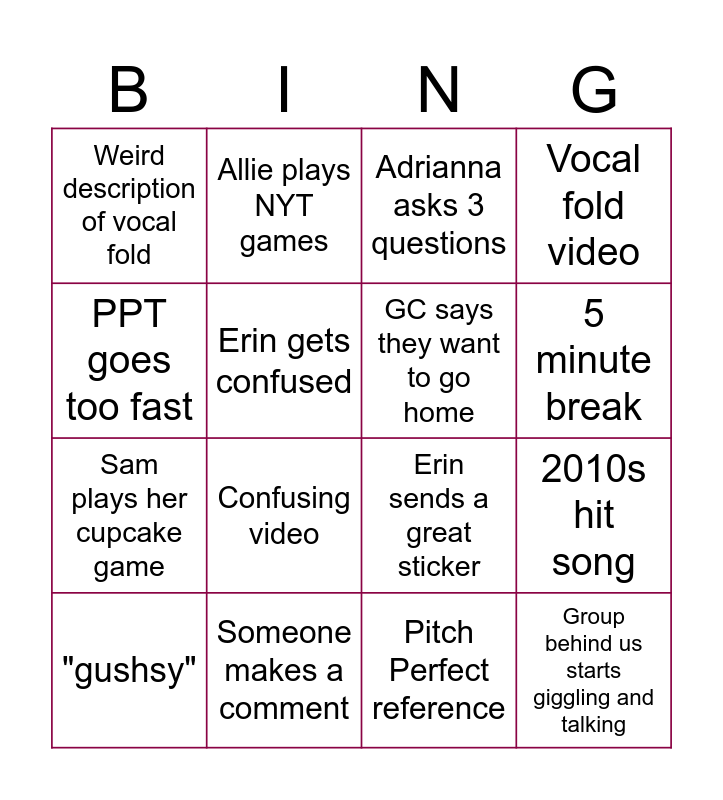 This bingo card has 16 words: Someone makes a comment, 2010s hit song, Adrianna asks 3 questions, Weird description of vocal fold, Sam plays her cupcake game, Allie plays NYT games, Erin sends a great sticker, Pitch Perfect reference, PPT goes too fast, Erin gets confused, "gushsy", Vocal fold video, Confusing video, 5 minute break, GC says they want to go home and Group behind us starts giggling and talking.