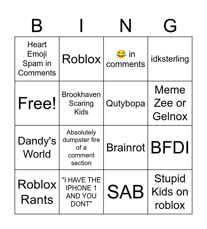 This bingo card has 16 words: "I HAVE THE IPHONE 1 AND YOU DONT", BFDI, 😂 in comments, Heart Emoji Spam in Comments, Dandy's World, Roblox, Brainrot, SAB, Free!, Brookhaven Scaring Kids, Roblox Rants, idksterling, Absolutely dumpster fire of a comment section, Meme Zee or Gelnox, Qutybopa and Stupid Kids on roblox.