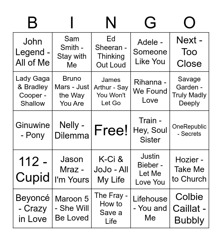 This bingo card has a free space and 29 words: Beyoncé - Crazy in Love, Usher - U Got It Bad, Nelly - Dilemma, Alicia Keys - If I Ain't Got You, John Legend - All of Me, Ed Sheeran - Thinking Out Loud, Bruno Mars - Just the Way You Are, Jason Mraz - I'm Yours, Train - Hey, Soul Sister, Maroon 5 - She Will Be Loved, OneRepublic - Secrets, Colbie Caillat - Bubbly, The Fray - How to Save a Life, Lifehouse - You and Me, Savage Garden - Truly Madly Deeply, Boyz II Men - I'll Make Love to You, K-Ci & JoJo - All My Life, 112 - Cupid, Next - Too Close, Ginuwine - Pony, Justin Bieber - Let Me Love You, Ne-Yo - So Sick, Rihanna - We Found Love, Lady Gaga & Bradley Cooper - Shallow, Adele - Someone Like You, Sam Smith - Stay with Me, Hozier - Take Me to Church, James Arthur - Say You Won't Let Go and Lewis Capaldi - Someone You Loved.