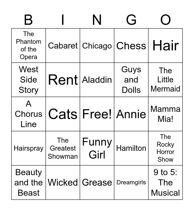 This bingo card has a free space and 30 words: Wicked, Evita, Cats, Les Misérables, The Phantom of the Opera, Chicago, Rent, Funny Girl, Annie, Grease, Mamma Mia!, 9 to 5: The Musical, Dreamgirls, The Lion King, The Little Mermaid, Frozen, Hamilton, Hairspray, The Greatest Showman, Hair, A Chorus Line, Sweet Charity, Cabaret, Guys and Dolls, West Side Story, Chess, The Rocky Horror Show, Beauty and the Beast, Aladdin and Footloose.