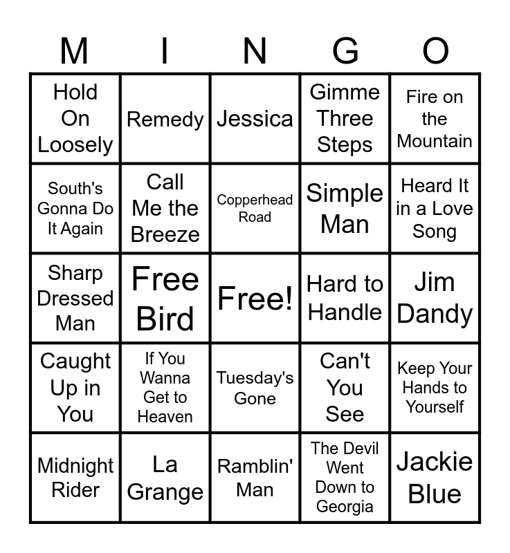 This bingo card has a free space and 36 words: Amie, Ballad of Curtis Loew, Black Betty, Call Me the Breeze, Can't You See, Caught Up in You, Copperhead Road, Dixie Chicken, Fire on the Mountain, Flirtin' with Disaster, Free Bird, Gimme Three Steps, Green Grass and High Tides, Hard to Handle, Heard It in a Love Song, Hold On Loosely, I'm No Angel, If You Wanna Get to Heaven, Jackie Blue, Jessica, Jim Dandy, Keep Your Hands to Yourself, La Grange, Midnight Rider, Ramblin' Man, Remedy, Sharp Dressed Man, She Talks to Angels, Simple Man, South's Gonna Do It Again, Sweet Home Alabama, That Smell, The Devil Went Down to Georgia, Tuesday's Gone, Tush and Whipping Post.