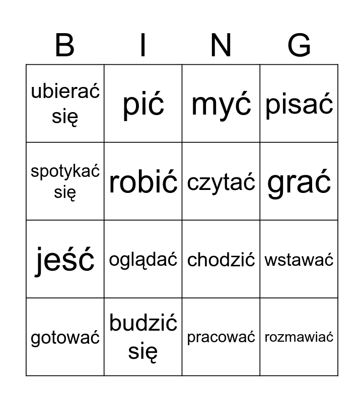 This bingo card has 16 words: budzić się, wstawać, myć, ubierać się, jeść, pić, chodzić, pracować, spotykać się, robić, gotować, pisać, oglądać, grać, czytać and rozmawiać.