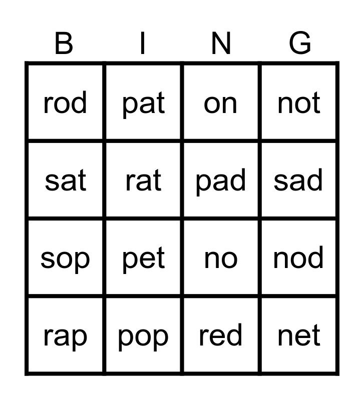 This bingo card has 16 words: pop, nod, on, rod, sop, pat, no, red, sat, rat, rap, not, pet, sad, pad and net.
