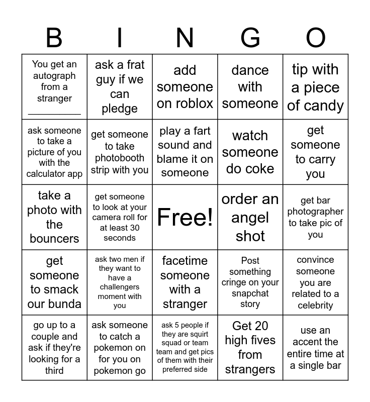 This bingo card has a free space and 29 words: go up to a couple and ask if they're looking for a third, get someone to sing karaoke with you at axis, get someone to look at your camera roll for at least 30 seconds, text a picture of someone you know to them, You get an autograph from a stranger __________, add someone on roblox, get someone to take photobooth strip with you, ask two men if they want to have a challengers moment with you, order an angel shot, ask someone to catch a pokemon on for you on pokemon go, get bar photographer to take pic of you, use an accent the entire time at a single bar, ask 5 people if they are squirt squad or team team and get pics of them with their preferred side, Get 20 high fives from strangers, get someone to carry you, get a picture of someone's id, facetime someone with a stranger, get someone to smack our bunda, tip with a piece of candy, take a photo with the bouncers, Post something cringe on your snapchat story, ask the dj to play the same song at least 4 times, watch someone do coke, ask someone to take a picture of you with the calculator app, dance with someone, ask a frat guy if we can pledge, convince someone you are related to a celebrity, play a fart sound and blame it on someone and ask to use someone's phone and walk away.