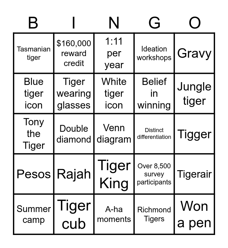 This bingo card has 39 words: Free!, Pink tiger icon, Green tiger icon, Tiger wearing glasses, Summer camp, Tiger King, White tiger icon, Competitor participants, Gravy, Pesos, Double diamond, Ideation workshops, Venn diagram, Tigger, Distinct differentiation, Rajah, Orange tiger icon, Tasmanian tiger, 7.5hrs interviewing customers, Over 8,500 survey participants, Blue tiger icon, A-ha moments, Belief in winning, Jungle tiger, Benji Marshall, BBQ, Won a pen, Tiger prawns, 10,000 winners per draw, $160,000 reward credit, Tiger Woods, 1:65 per draw, 1:11 per year, Tiger cub, Richmond Tigers, Tiger snake, Tigerair, Tony the Tiger and Tigerlily.