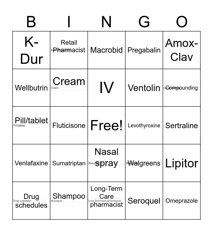 This bingo card has 18 images, a free space and 40 words: Inhaler, Pill/tablet, Vaccine, Cream, Shampoo, Nasal spray, IV, Liquid, Amox-Clav, Venlafaxine, Fluticisone, Pregabalin, Omeprazole, Sertraline, Levothyroxine, Sumatriptan, Flomax, K-Dur, Cipro, Macrobid, Lipitor, Seroquel, Ventolin, Wellbutrin, CDC, FDA, OSHA, Clinical trials, Drug tiers, DEA Number, Drug Class, Drug schedules, DEA, Walgreens, Compounding, Long-Term Care pharmacist, Vetrinary Pharmacist, Compounding pharmacist, Retail Pharmacist and ER Pharmacist.