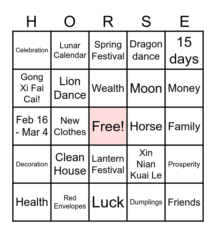 This bingo card has a free space and 30 words: Red Envelopes, Red, New Clothes, Food, Celebration, Spring Festival, Lion Dance, Lantern Festival, Horse, Luck, Family, Friends, Dumplings, Music, Money, Lantern, Xin Nian Kuai Le, Decoration, Clean House, 15 days, Feb 16 - Mar 4, Treats, Lunar Calendar, Moon, Gong Xi Fai Cai!, Dragon dance, Prosperity, Health, Wealth and Tangerines and Oranges.