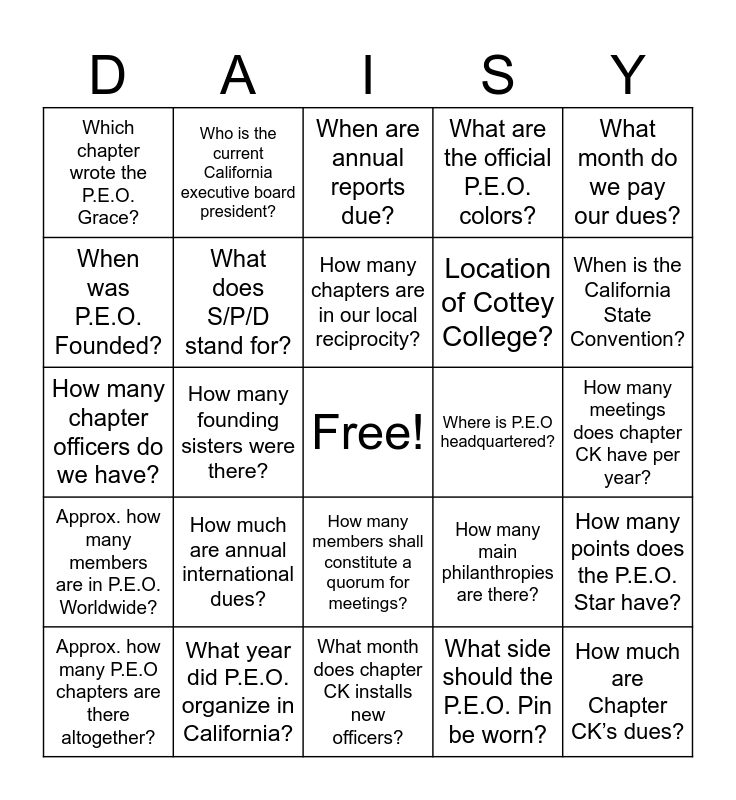 This bingo card has a free space and 24 words: How much are annual international dues?, What year did P.E.O. organize in California?, How many chapters are in our local reciprocity?, Approx. how many P.E.O chapters are there altogether?, What month do we pay our dues?, Which chapter wrote the P.E.O. Grace?, When was P.E.O. Founded?, Who is the current California executive board president?, Where is P.E.O headquartered?, How many members shall constitute a quorum for meetings?, Location of Cottey College?, How many chapter officers do we have?, How many main philanthropies are there?, How many points does the P.E.O. Star have?, What does S/P/D stand for?, What side should the P.E.O. Pin be worn?, How many meetings does chapter CK have per year?, When are annual reports due?, When is the California State Convention?, How many founding sisters were there?, How much are Chapter CK’s dues?, Approx. how many members are in P.E.O. Worldwide?, What are the official P.E.O. colors? and What month does chapter CK installs new officers?.