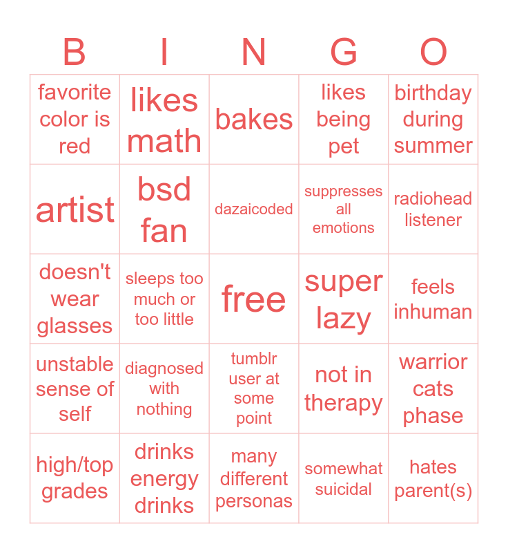 This bingo card has a free space and 24 words: diagnosed with nothing, drinks energy drinks, dazaicoded, high/top grades, birthday during summer, favorite color is red, artist, likes math, super lazy, tumblr user at some point, suppresses all emotions, doesn't wear glasses, not in therapy, warrior cats phase, bsd fan, somewhat suicidal, feels inhuman, bakes, radiohead listener, sleeps too much or too little, hates parent(s), unstable sense of self, likes being pet and many different personas.