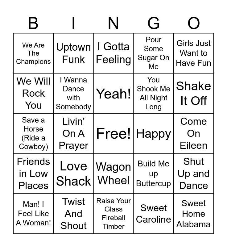 This bingo card has a free space and 32 words: Sweet Caroline, Don't Stop Believin', Livin' On A Prayer, Mr. Brightside, Friends in Low Places, I Wanna Dance with Somebody, Girls Just Want to Have Fun, Shut Up and Dance, Uptown Funk, Party Rock Anthem, Yeah!, I Gotta Feeling, Hey Ya!, CAN'T STOP THE FEELING!, Happy, September, Man! I Feel Like A Woman!, Save a Horse (Ride a Cowboy), Wagon Wheel, Love Shack, Build Me up Buttercup, I'm a Believer, Come On Eileen, Twist And Shout, Sweet Home Alabama, Pour Some Sugar On Me, You Shook Me All Night Long, We Will Rock You, We Are The Champions, Raise Your Glass Fireball Timber, Tik Tok and Shake It Off.