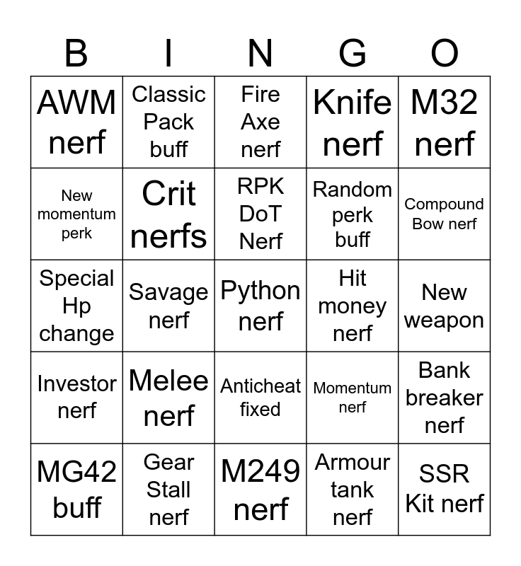 This bingo card has a free space and 24 words: Melee nerf, Gear Stall nerf, RPK DoT Nerf, MG42 buff, M32 nerf, AWM nerf, New momentum perk, Classic Pack buff, Hit money nerf, Anticheat fixed, Random perk buff, Special Hp change, Momentum nerf, Bank breaker nerf, Crit nerfs, Armour tank nerf, New weapon, Fire Axe nerf, Compound Bow nerf, Savage nerf, SSR Kit nerf, Investor nerf, Knife nerf and M249 nerf.