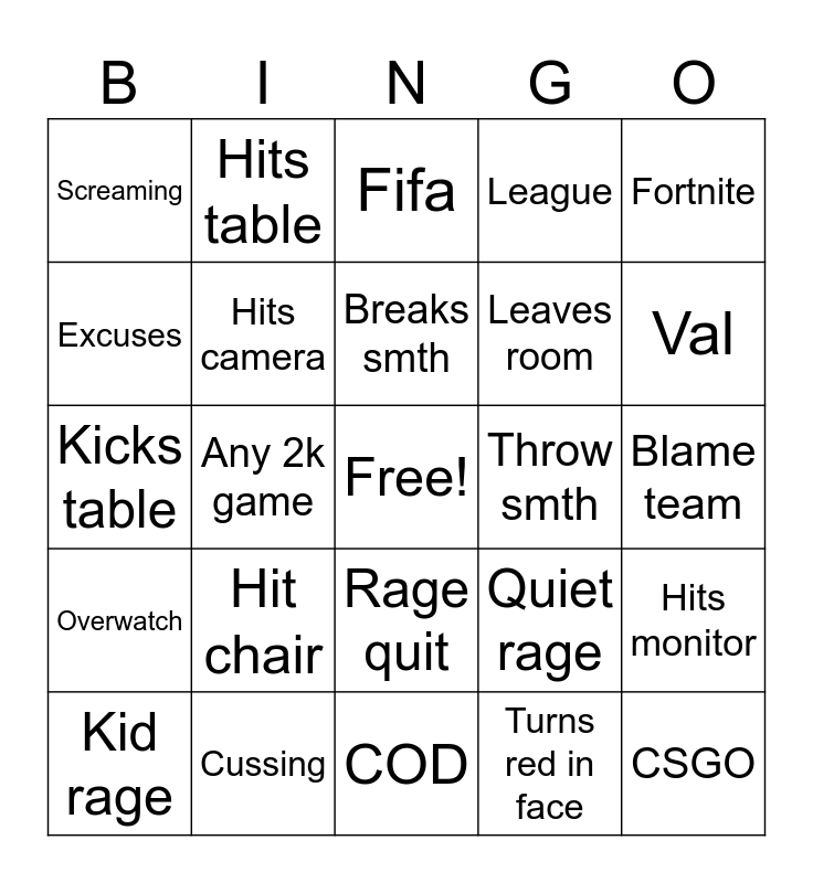 This bingo card has a free space and 24 words: Hit chair, Cussing, Breaks smth, Kid rage, Fortnite, Screaming, Excuses, Hits table, Throw smth, Rage quit, Leaves room, Kicks table, Quiet rage, Hits monitor, Hits camera, Turns red in face, Blame team, Fifa, Val, Any 2k game, CSGO, Overwatch, League and COD.