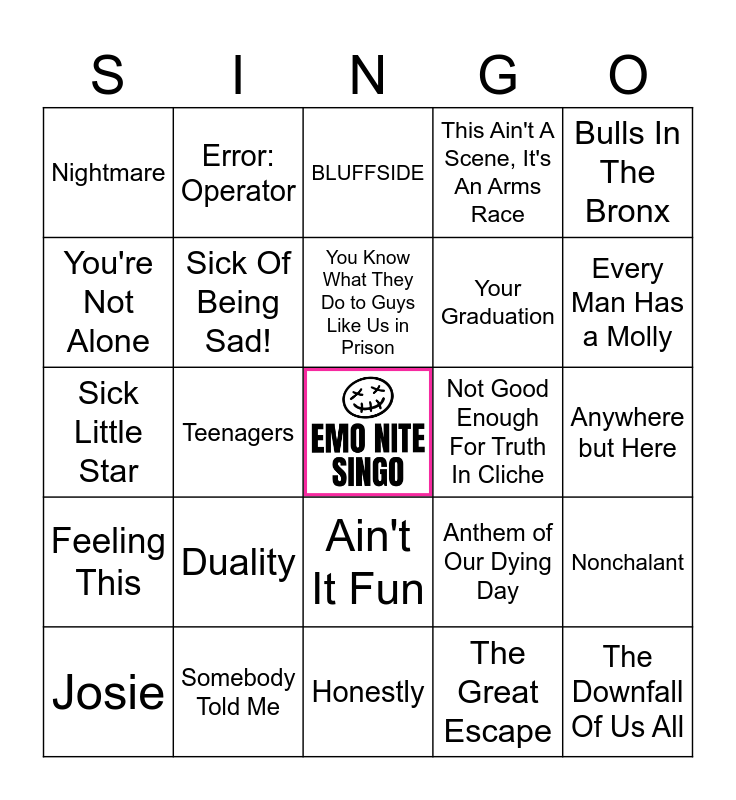 This bingo card has a free space and 40 words: Better Bitter, Sick Little Star, OMWDOWN!, Sick Of Being Sad!, Somebody Told Me, Ain't It Fun, You Know What They Do to Guys Like Us in Prison, Girlfriend, Bulls In The Bronx, Feeling This, Teenagers, This Ain't A Scene, It's An Arms Race, The Downfall Of Us All, Anywhere but Here, Not Good Enough For Truth In Cliche, Duality, Horrible Kids, Nightmare, S2L, BLUFFSIDE, Nonchalant, The Great Escape, Your Graduation, You're Not Alone, Emily, Woe, In This Diary, Fat Lip, Reinventing Your Exit, The Best Of Me, Since U Been Gone, Josie, If It Means a Lot to You, Anthem of Our Dying Day, Every Man Has a Molly, Honestly, Bring Me To Life, There's a Class for This, Error: Operator and Chop Suey!.