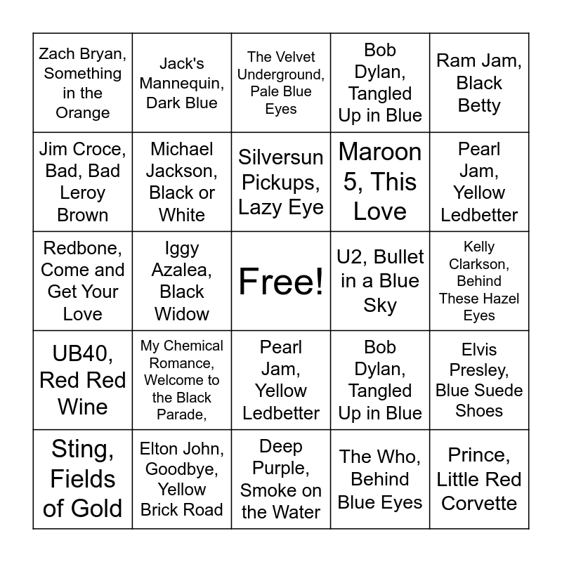 ⚠ This card has duplicate items: 311, Amber (2), AC/DC, Back in Black (2), Amy Winehouse, Back to Black (2), Billy Idol, White Wedding (2), Blue Oyster Cult, Don't Fear the Reaper (2), Bob Dylan, Tangled Up in Blue (2), Bobby Vinton, Blue Velvet (2), Booker T & the MGs, Green Onions (2), Brooks and Dunn, Red Dirt Road (2), Bruce Springsteen, Pink Cadillac (2), Coldplay, Yellow (2), Concrete Blonde, Joey (2), Cream, White Room (2), Dave Matthews Band, Grey Street (2), Deep Blue Something, Breakfast at Tiffany's (2), Deep Purple, Smoke on the Water (2), Dido, White Flag (2), Doja Cat, Paint the Town Red (2), Eiffel 65, Blue (Da-ba-dee) (2), Electric Light Orchestra, Mr. Blue Sky (2), Elton John, Goodbye, Yellow Brick Road (2), Elvis Presley, Blue Suede Shoes (2), Golden Earring, Radar Love (2), Grateful Dead, Scarlet Begonias (2), Harry Styles, Golden (2), Iggy Azalea, Black Widow (2), Jack's Mannequin, Dark Blue (2), Jefferson Airplane, White Rabbit, (2), Jim Croce, Bad, Bad Leroy Brown (2), Jimi Hendrix, Purple Haze (2), Johnny Cash, Folsom Prison Blues (2), Joni Mitchell, Big Yellow Taxi (2), Kanye West, Gold Digger (2), Kelly Clarkson, Behind These Hazel Eyes (2), Kendrick Lamar, Black Magic Woman (2), KT Tunstall, Black Horse and the Cherry Tree (2), Lana del Rey, Blue Jeans (2), Led Zeppelin, Black Dog (2), Maroon 5, This Love (2), Michael Jackson, Black or White (2), My Chemical Romance, Welcome to the Black Parade, (2), LeAnn Rimes, Blue (2), Pearl Jam, Yellow Ledbetter (2), Pink Floyd, Wish You Were Here (2), Prince, Little Red Corvette (2), Ram Jam, Black Betty (2), Red Hot Chili Peppers, Can't Stop (2), Redbone, Come and Get Your Love (2), Santana, Black Magic Woman (2), Shocking Blue, Venus (2), Silversun Pickups, Lazy Eye (2), Soundgarden, Black Hole Sun (2), Sting, Fields of Gold (2), Taylor Swift, Red (2), The Beatles, Yellow Submarine (2), The Black Crowes, Hard to Handle (2), The Black Keys, Gold on the Ceiling (2), The Marcels, Blue Moon (2), The Offspring, Pretty Fly (For a White Guy) (2), The Rolling Stones, Paint It, Black (2), The Velvet Underground, Pale Blue Eyes (2), The White Stripes, We're Going to Be Friends (2), The Who, Behind Blue Eyes (2), Toby Keith, Red Solo Cup (2), Tommy James and the Shondells, Crimson and Clover (2), U2, Bullet in a Blue Sky (2), UB40, Red Red Wine (2), Whitesnake, Here I Go Again (2), Will Smith, Men in Black (2), Wiz Khalifa, Black and Yellow (2), Yellowcard, Only One (2), Kiiara, Gold (2), Zach Bryan, Something in the Orange (2), HUNTR/X, Golden (2)