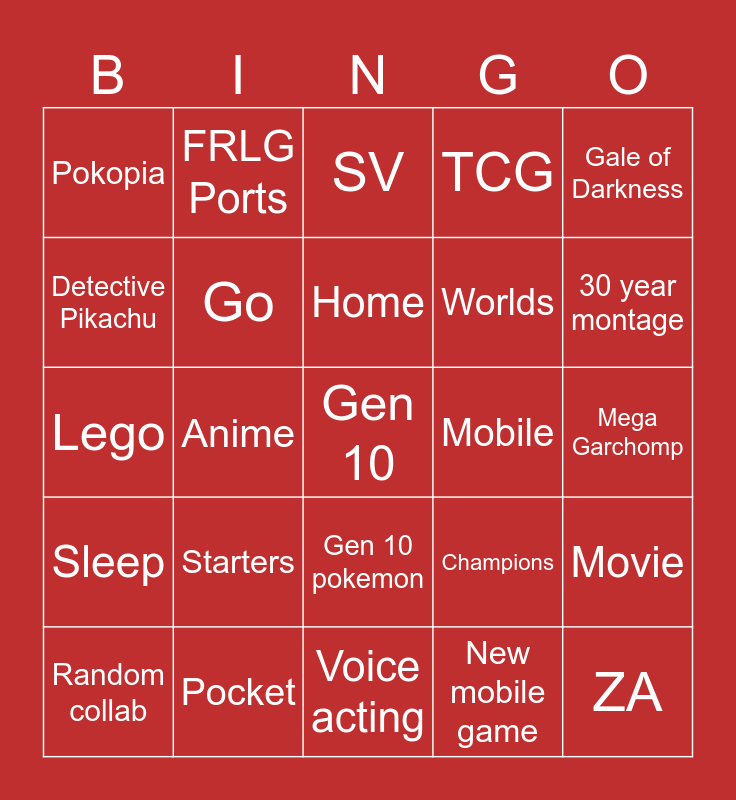 This bingo card has a free space and 24 words: Starters, Pocket, Home, Random collab, Gale of Darkness, Pokopia, Detective Pikachu, FRLG Ports, Mobile, Gen 10 pokemon, Worlds, Lego, Champions, Movie, Go, New mobile game, Mega Garchomp, SV, 30 year montage, Anime, ZA, Sleep, TCG and Voice acting.