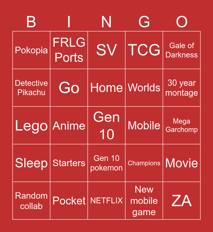 This bingo card has a free space and 24 words: Starters, Pocket, Home, Random collab, Gale of Darkness, Pokopia, Detective Pikachu, FRLG Ports, Mobile, Gen 10 pokemon, Worlds, Lego, Champions, Movie, Go, New mobile game, Mega Garchomp, SV, 30 year montage, Anime, ZA, Sleep, TCG and NETFLIX.