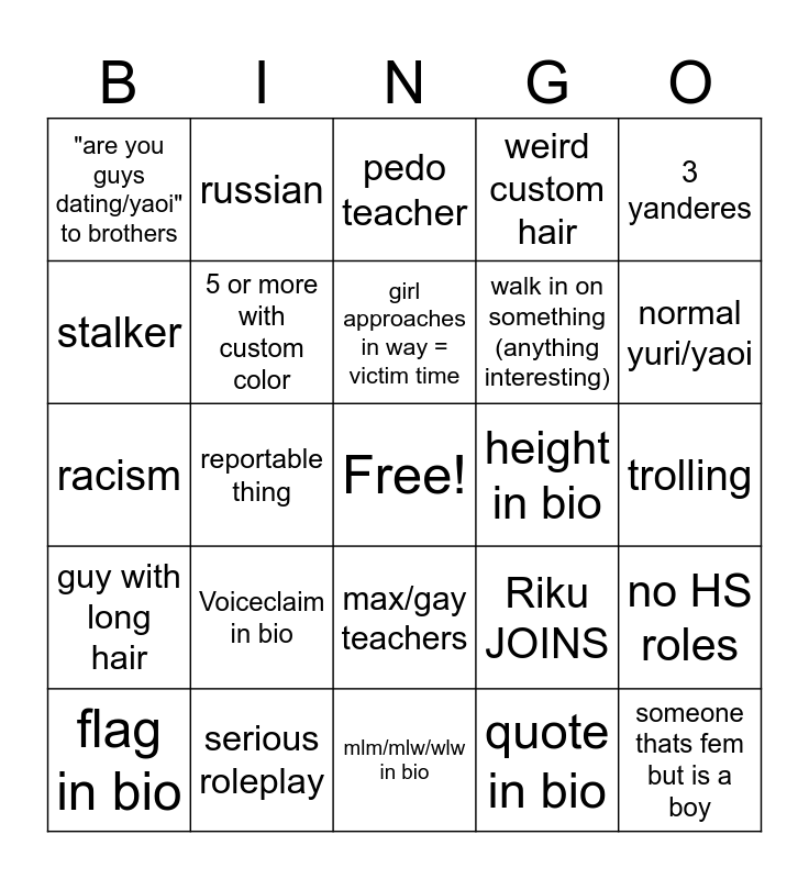 This bingo card has a free space and 24 words: flag in bio, Voiceclaim in bio, girl approaches in way = victim time, quote in bio, 3 yanderes, "are you guys dating/yaoi" to brothers, russian, pedo teacher, height in bio, trolling, racism, 5 or more with custom color, Riku JOINS, no HS roles, stalker, serious roleplay, mlm/mlw/wlw in bio, weird custom hair, normal yuri/yaoi, guy with long hair, reportable thing, max/gay teachers, walk in on something (anything interesting) and someone thats fem but is a boy.