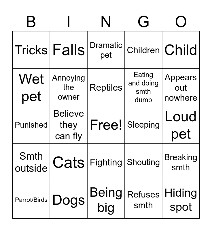 This bingo card has a free space and 24 words: Cats, Dogs, Reptiles, Parrot/Birds, Child, Tricks, Wet pet, Falls, Sleeping, Fighting, Eating and doing smth dumb, Punished, Shouting, Breaking smth, Annoying the owner, Refuses smth, Loud pet, Dramatic pet, Appears out nowhere, Believe they can fly, Hiding spot, Smth outside, Children and Being big.