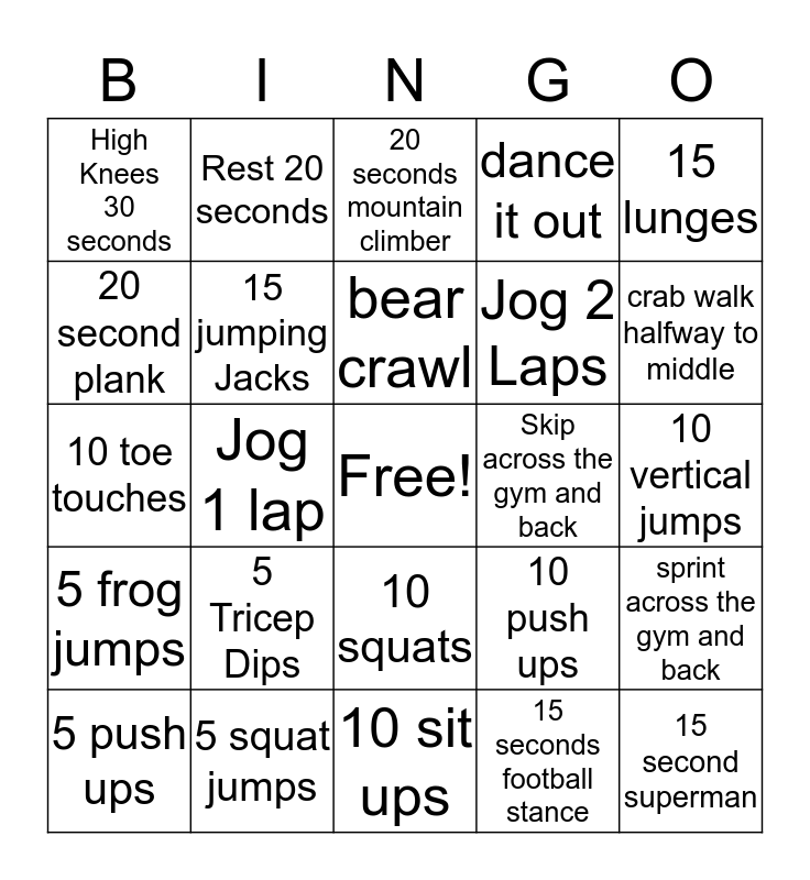 This bingo card has a free space and 24 words: 5 Tricep Dips, 5 squat jumps, bear crawl, 5 push ups, 15 lunges, High Knees 30 seconds, 20 second plank, Rest 20 seconds, Skip across the gym and back, 10 squats, Jog 2 Laps, 10 toe touches, 10 push ups, sprint across the gym and back, 15 jumping Jacks, 15 seconds football stance, 10 vertical jumps, 20 seconds mountain climber, crab walk halfway to middle, Jog 1 lap, 15 second superman, 5 frog jumps, dance it out and 10 sit ups.