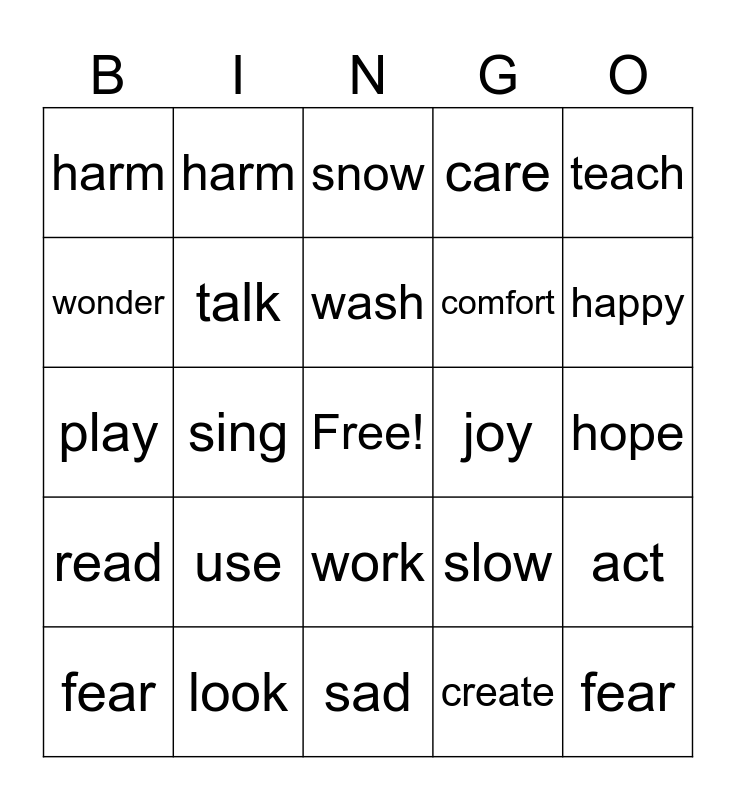 This bingo card has a free space and 40 words: help, play, jump, talk, look, work, wash, paint, teach, read, sing, care, fear, hope, joy, use, move, harm, farm, snow, act, create, comfort, wonder, respect, power, color, beauty, friend, care, hope, fear, quick, slow, happy, sad, help, care, harm and use.