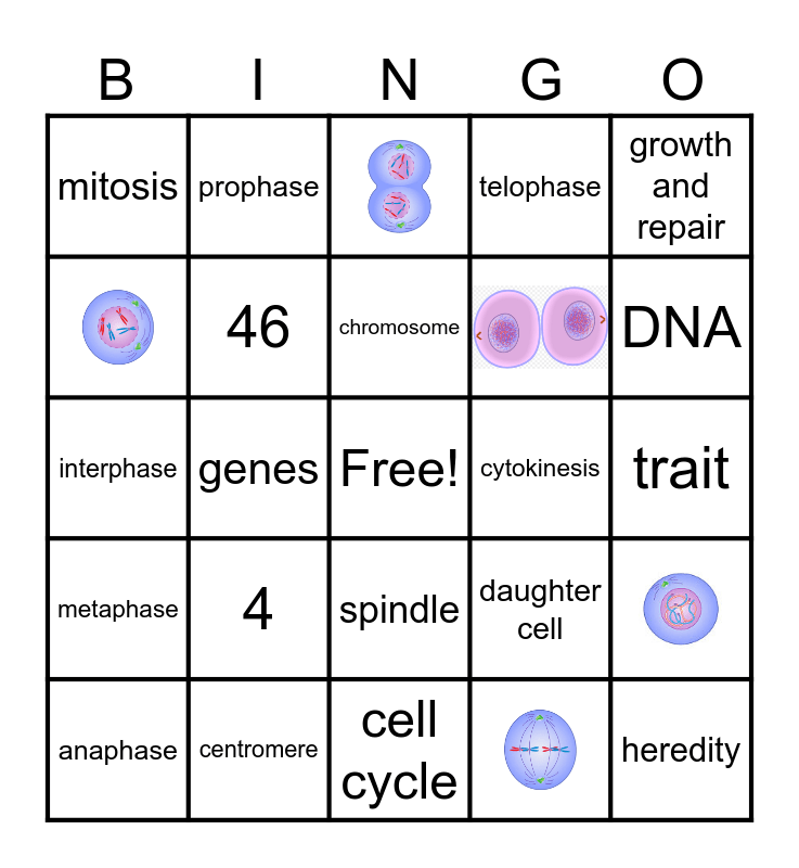 This bingo card has 6 images, a free space and 22 words: prophase, metaphase, cytokinesis, anaphase, interphase, telophase, centromere, cell cycle, DNA, chromatid, 4, 46, chromosome, spindle, mitosis, phase, heredity, genes, trait, daughter cell, growth and repair and nuclear membrane.