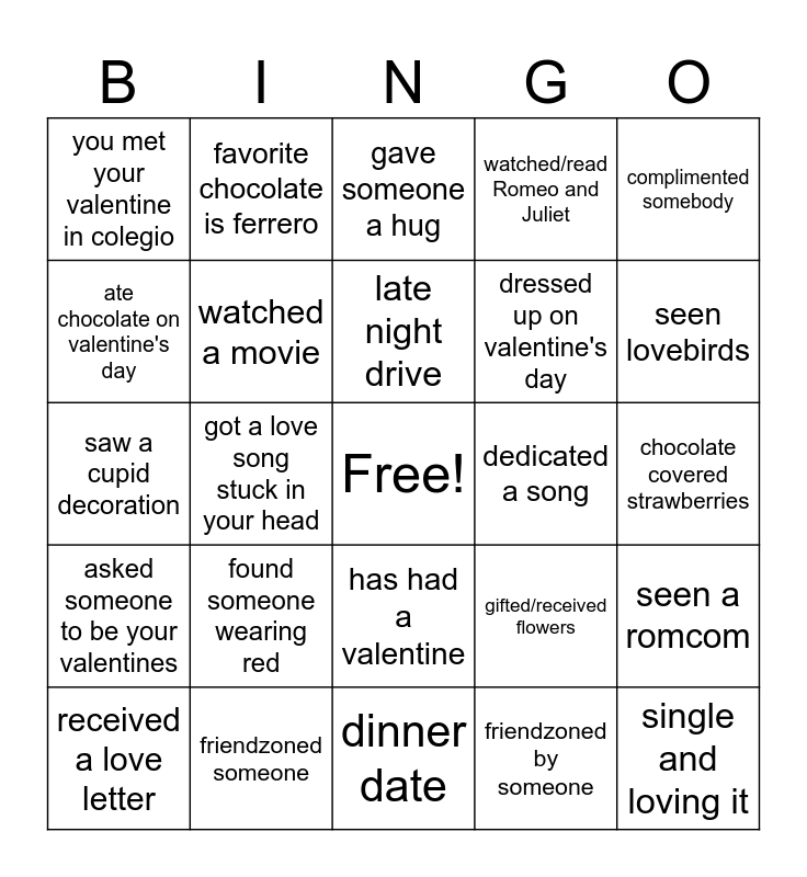 This bingo card has a free space and 27 words: gifted/received flowers, wrote a poem, dressed up on valentine's day, dinner date, ate chocolate on valentine's day, gave someone a hug, favorite chocolate is ferrero, asked someone to be your valentines, dedicated a song, seen a romcom, saw a cupid decoration, watched/read Romeo and Juliet, received a love letter, friendzoned someone, seen lovebirds, stargazed together, watched a movie, late night drive, found someone wearing red, you met your valentine in colegio, chocolate covered strawberries, friendzoned by someone, got a love song stuck in your head, single and loving it, has had a valentine, complimented somebody and drove 3+ hours to see their date.