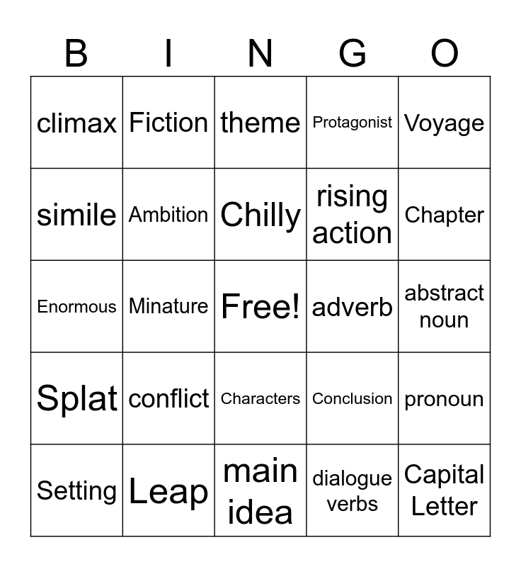 This bingo card has a free space and 40 words: Predict, Enormous, Fearless, Ambition, Leap, Characters, Chilly, Setting, Voyage, Splat, Minature, Protagonist, Capital Letter, abstract noun, adverb, conflict, resolution, climax, narrator, theme, pronoun, dialogue verbs, rising action, simile, foreshadowing, sequence, Question Mark, Author, Period, Noun, Protagonists, Setting, Introduction, Conclusion, Chapter, main idea, blurb, rhyme, Fiction and non fiction.