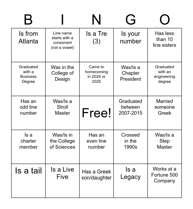 This bingo card has a free space and 24 words: Was/Is in the College of Sciences, Is a Live Five, Came to homecoming in 2024 or 2025, Is a tail, Has less than 10 line sisters, Is from Atlanta, Graduated with a Business Degree, Line name starts with a consonant (not a vowel), Graduated between 2007-2015, Has an even line number, Was/Is a Chapter President, Has an odd line number, Crossed in the 1990s, Was/Is a Step Master, Was in the College of Design, Is a Legacy, Married someone Greek, Is a Tre (3), Graduated with an engineering degree, Was/Is a Stroll Master, Works at a Fortune 500 Company, Is a charter member, Is your number and Has a Greek son/daughter.