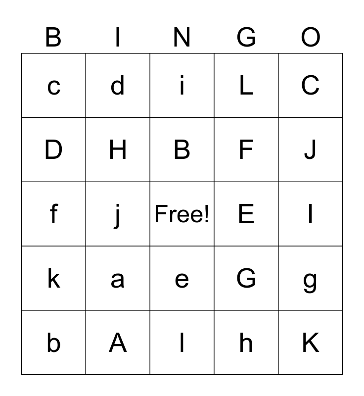 This bingo card has a free space and 24 words: a, A, B, b, C, c, D, d, E, e, F, f, G, g, H, h, I, i, J, j, K, k, L and l.