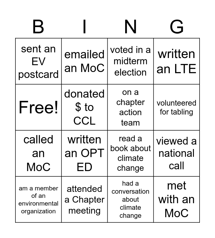 This bingo card has 16 words: attended a Chapter meeting, viewed a national call, voted in a midterm election, sent an EV postcard, called an MoC, emailed an MoC, read a book about climate change, had a conversation about climate change, Free!, donated $ to CCL, am a member of an environmental organization, written an LTE, written an OPT ED, volunteered for tabling, on a chapter action team and met with an MoC.