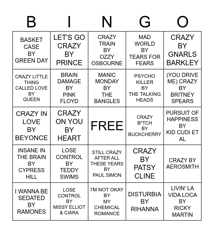 This bingo card has a free space and 24 words: LOSE CONTROL BY TEDDY SWIMS, LOSE CONTROL BY MISSY ELLIOT & CIARA, MANIC MONDAY BY THE BANGLES, I WANNA BE SEDATED BY RAMONES, CRAZY BY GNARLS BARKLEY, BASKET CASE BY GREEN DAY, CRAZY LITTLE THING CALLED LOVE BY QUEEN, LET'S GO CRAZY BY PRINCE, CRAZY B*TCH BY BUCKCHERRY, STILL CRAZY AFTER ALL THESE YEARS BY PAUL SIMON, PSYCHO KILLER BY THE TALKING HEADS, CRAZY IN LOVE BY BEYONCE, CRAZY BY PATSY CLINE, CRAZY BY AEROSMITH, BRAIN DAMAGE BY PINK FLOYD, DISTURBIA BY RIHANNA, PURSUIT OF HAPPINESS BY KID CUDI ET AL, CRAZY TRAIN BY OZZY OSBOURNE, (YOU DRIVE ME) CRAZY BY BRITNEY SPEARS, CRAZY ON YOU BY HEART, LIVIN' LA VIDA LOCA BY RICKY MARTIN, INSANE IN THE BRAIN BY CYPRESS HILL, MAD WORLD BY TEARS FOR FEARS and I'M NOT OKAY BY MY CHEMICAL ROMANCE.